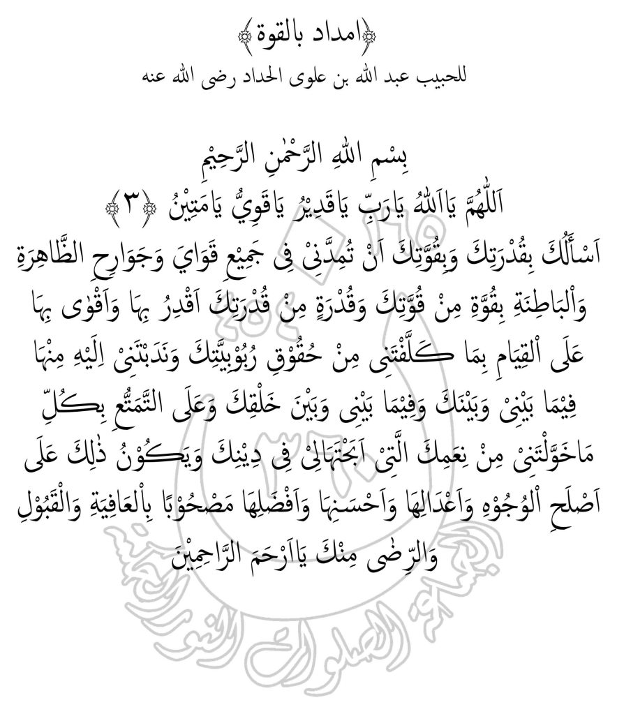 Wirid ini di namakan Imdad bil Quwwah dari Al Habib Abdullah bin Alwi Al Haddad ra, salah seorang ulama besar dan wali quthub yang masyhur. beliau banyak mengarang kitab kitab yang bermutu, diantaranya adalah kitab Nashoihud Diniyyah.