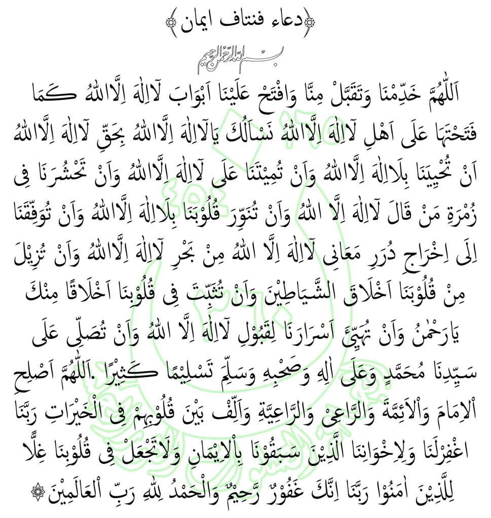 Barangsiapa yang ingin hidupnya dan matinya selalu dalam naungan kalimat tauhid, maka hendaklah ia membiasakan diri membaca do’a berikut dibawah ini setiap selesai shalat lima waktu. selain itu, orang yang mendawwamkannya doa ini, akan mendapatkan juga rahasia rahasia yang menjakjubkan. Hatinya akan bercahaya. dan segala akhlak tercela dalam hatinya akan terkikis habis, kemudian tempatnya di gantikan dengan akhlak akhlak terpiju dan mulia.